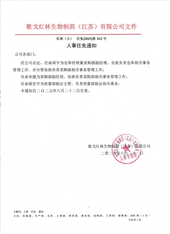3.Liang Hongyu is appointed as Validation Supervisor of the Quality Department, responsible for validation-related affairs within the department.