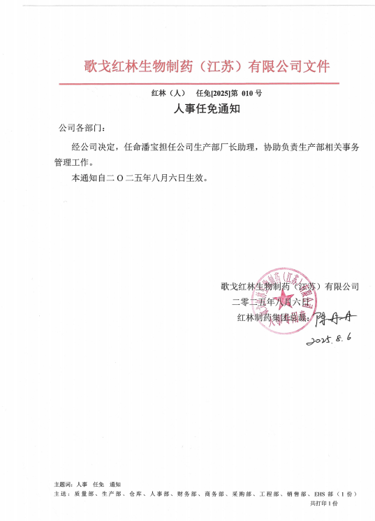 We hereby announce that, pursuant to the company’s decision, Pan Bao has been appointed as Assistant Plant Director of the Production Department. In this role, he will assist in managing operations and related affairs within the department.