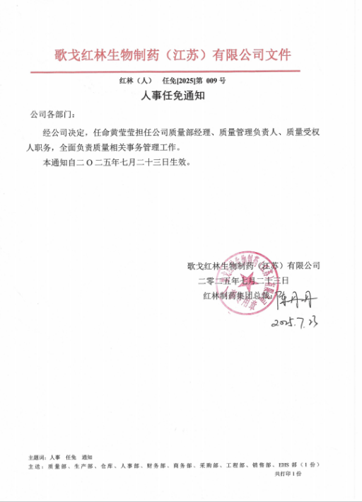 We hereby announce that, pursuant to the company’s decision, Huang Yingying has been appointed as Quality Department Manager, Head of Quality Management, and Qualified Person, with overall responsibility for quality-related operations and management.